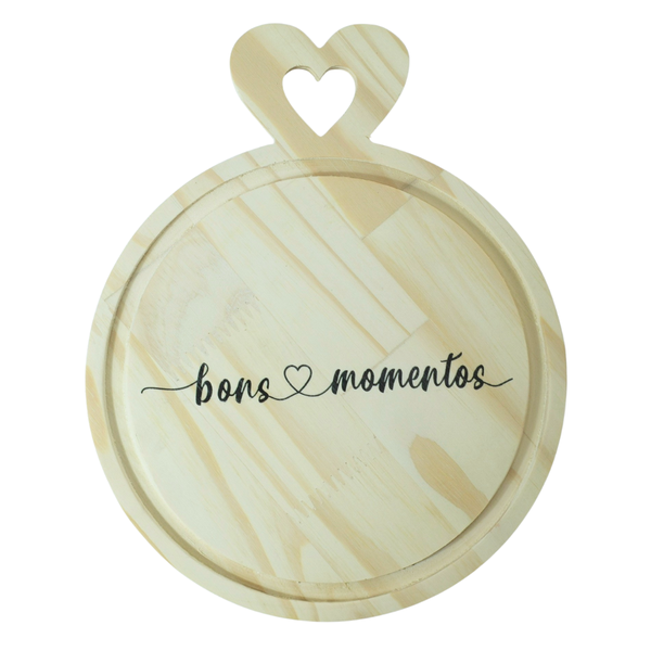 - Bandeja Redonda com Pegador de Coração e Gravação a Laser Frase Bons Momentos