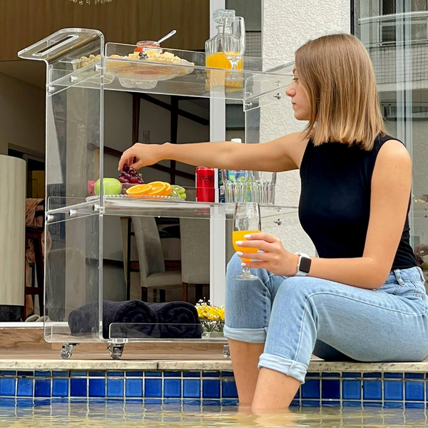 Imagine servir drinks e petiscos com um toque de sofisticação que encanta seus convidados! Esse carrinho móvel em acrílico cristal é perfeito para bares, áreas de piscina ou chás elegantes. Com design moderno e transparente, ele traz leveza e organização para qualquer ambiente, mantendo tudo ao alcance das mãos. Prático e cheio de estilo, ele transforma seu momento de lazer em uma experiência gourmet. Adquira já e surpreenda a todos com muito bom gosto!